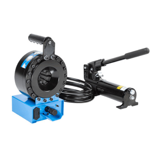 Радиальный обжимной пресс для ремонтных мастерских. Несмотря на небольшой вес и привод, не требующий электропитания, позволяет достичь силы сжатия до 1000 кН и обжимать шланги до 1". Легкое в применении устройство регулировки делает данный пресс точным и простым в эксплуатации. Позволяет использовать пресс для оперативной работы со шлангами прямо на рабочем месте. Имеет постоянную центральную линию перемещения кулачков.
